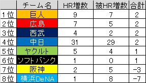 3.チーム別得失点、本塁打増減ランキング