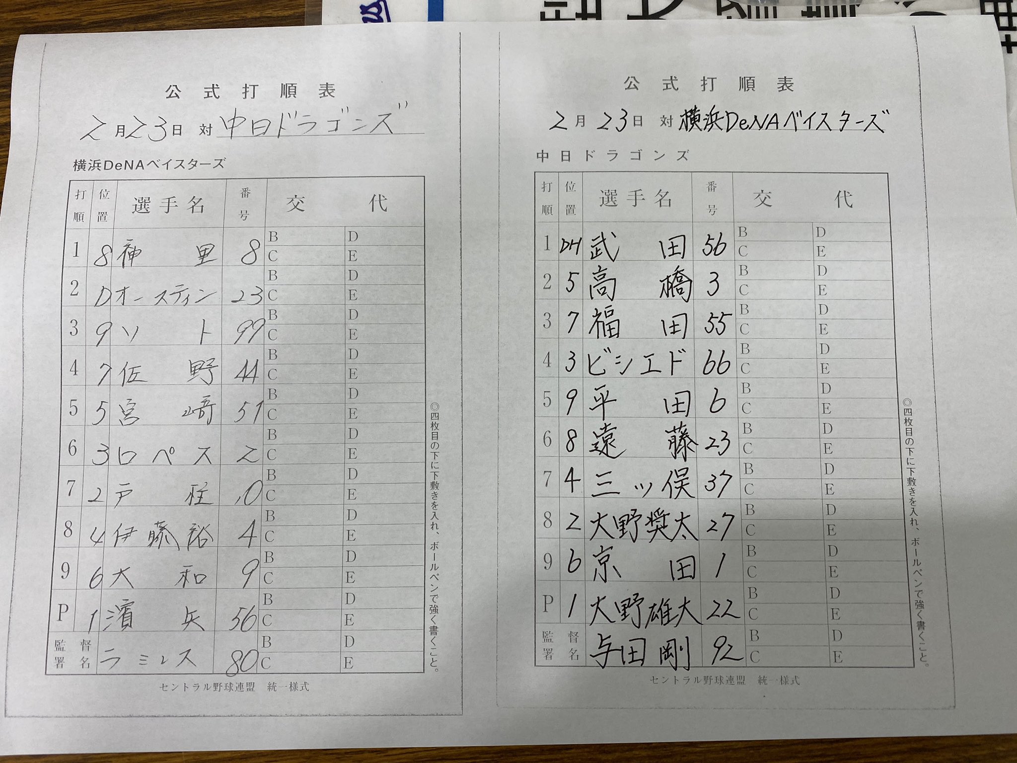 本日のオープン戦。ベイスターズ戦のスタメン表です。