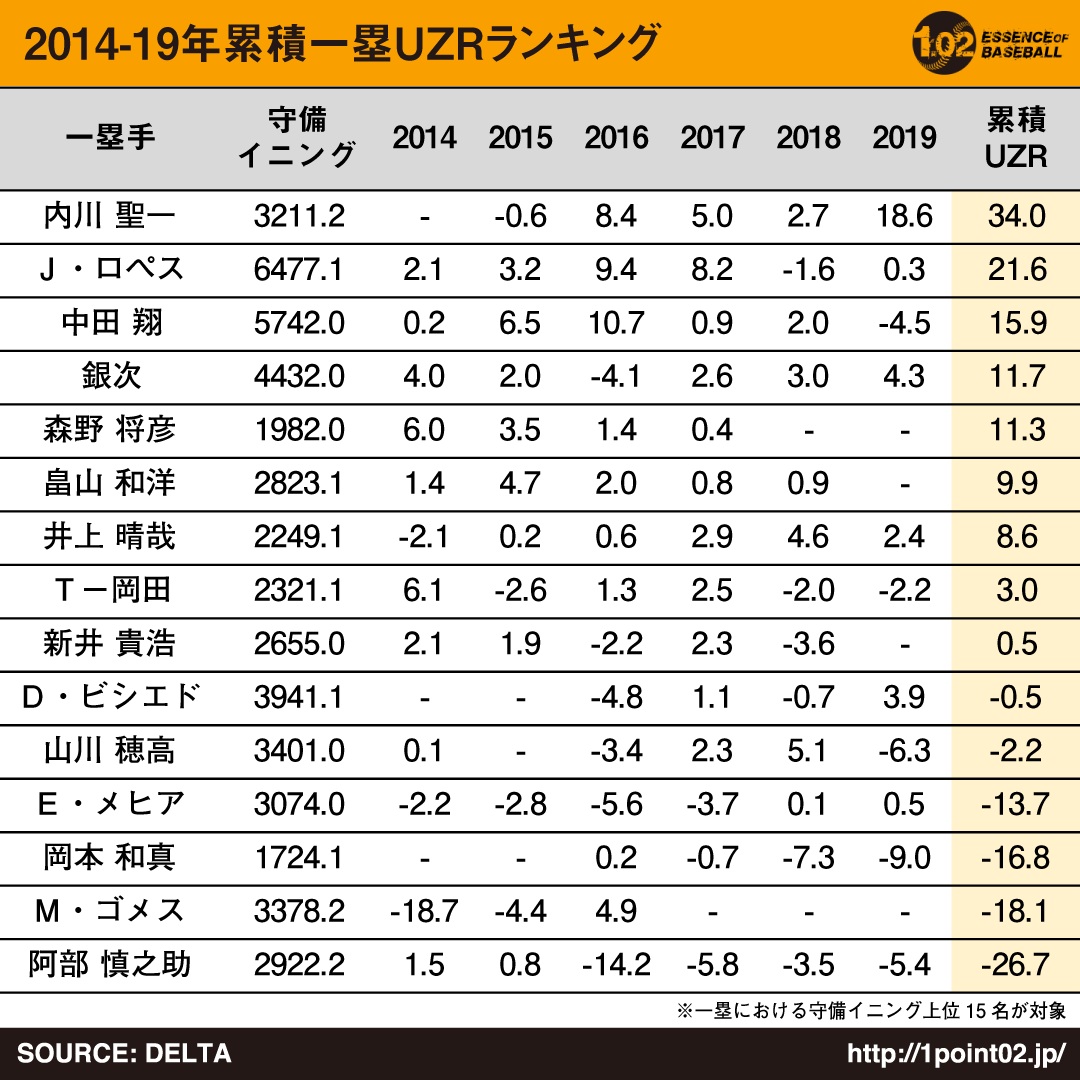 守備の上手い一塁手は? 2014年~2019年 ファースト累積UZRランキング