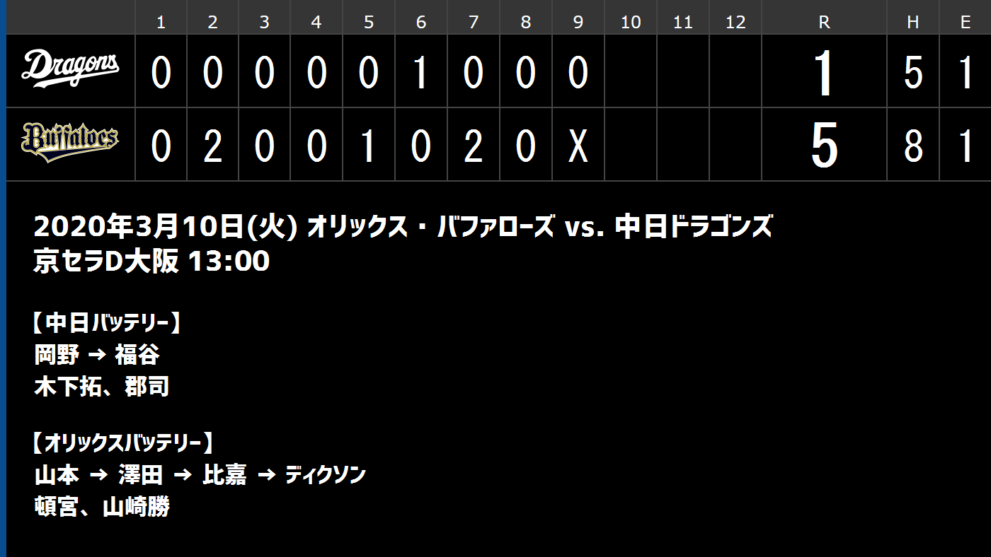 3月10日(火) オープン戦「オリックスvs.中日」 スコア速報
