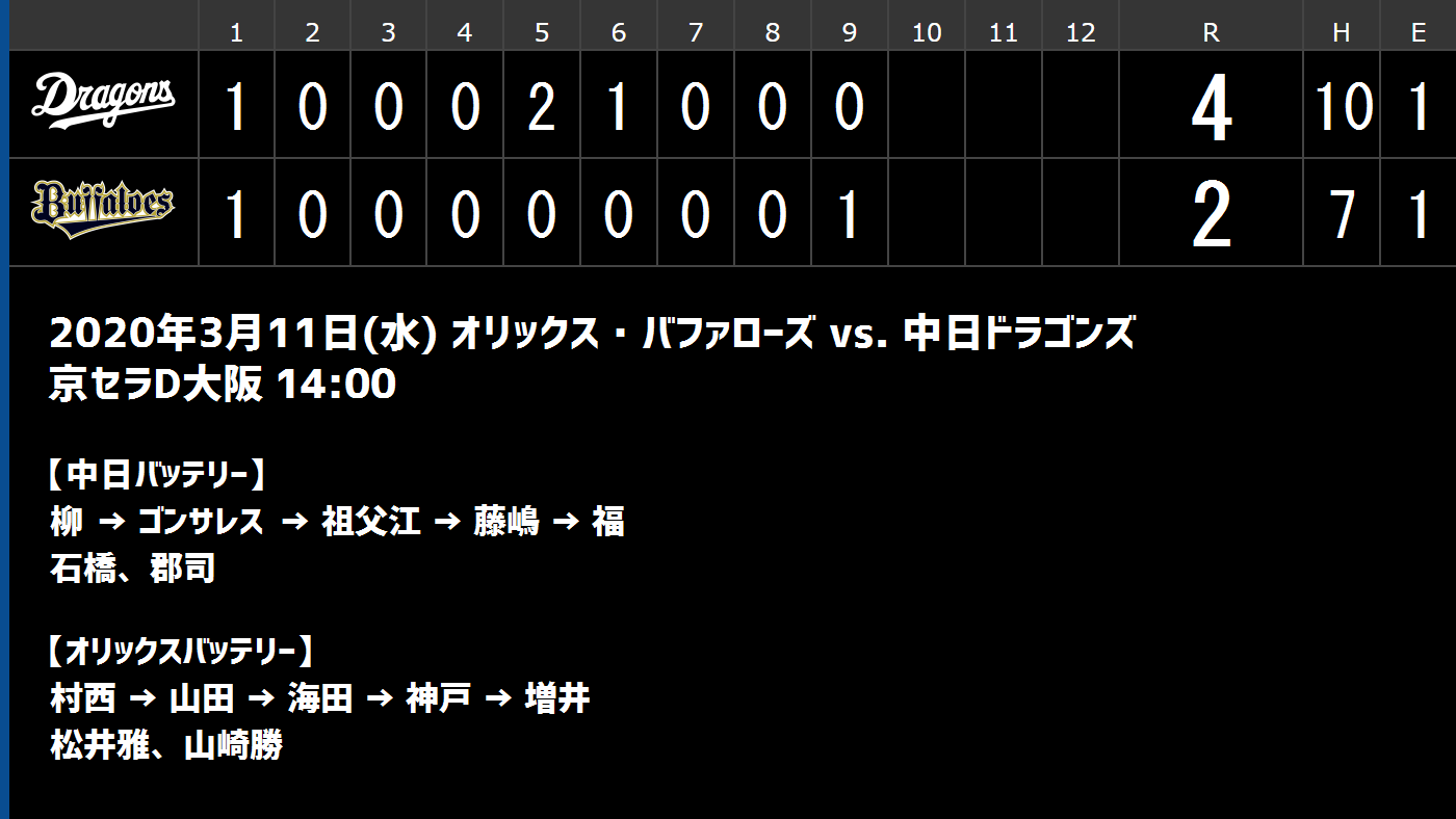 3月11日(水) オープン戦「オリックスvs.中日」 スコア速報