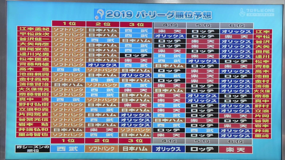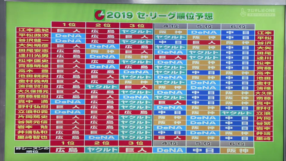▼1年前放送の「プロ野球ニュース2019 開幕SP」での順位予想