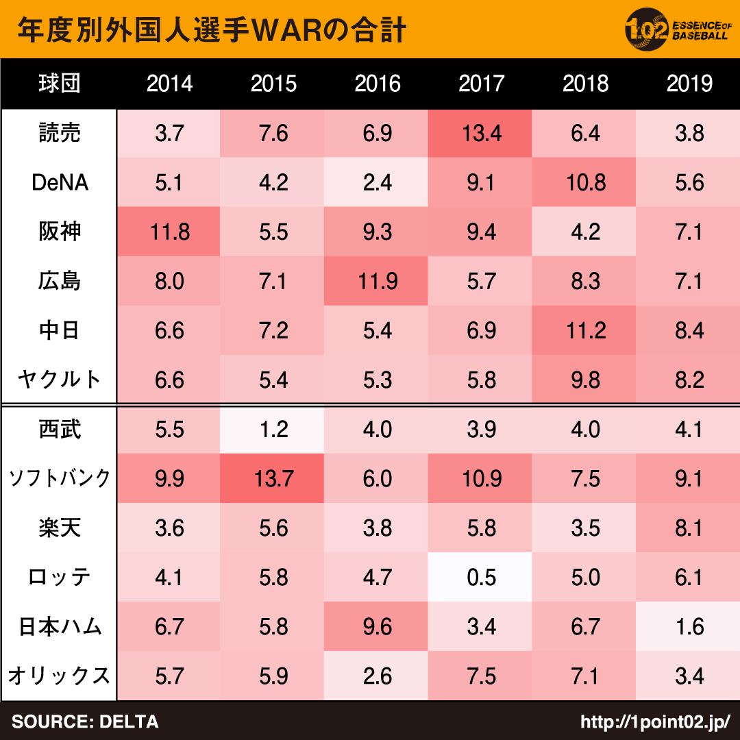 外国人選手の層が厚いソフトバンクは、毎年安定して高いWARを記録しつづけている。読売は昨季優勝を果たしたもののまだ上積みの余地あり。日本ハムは昨季、外国人選手のはたらきが最も小さかった。https://t.co/1NZt0IBw8M pic.twitter.com/zm0ZWFDZxX