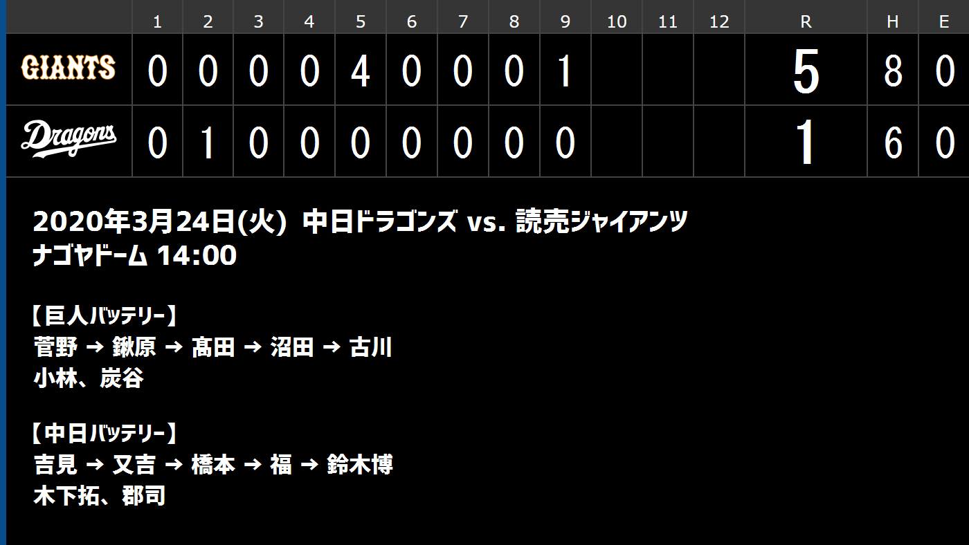 3月24日(火) 練習試合「中日vs.巨人」 スコア速報