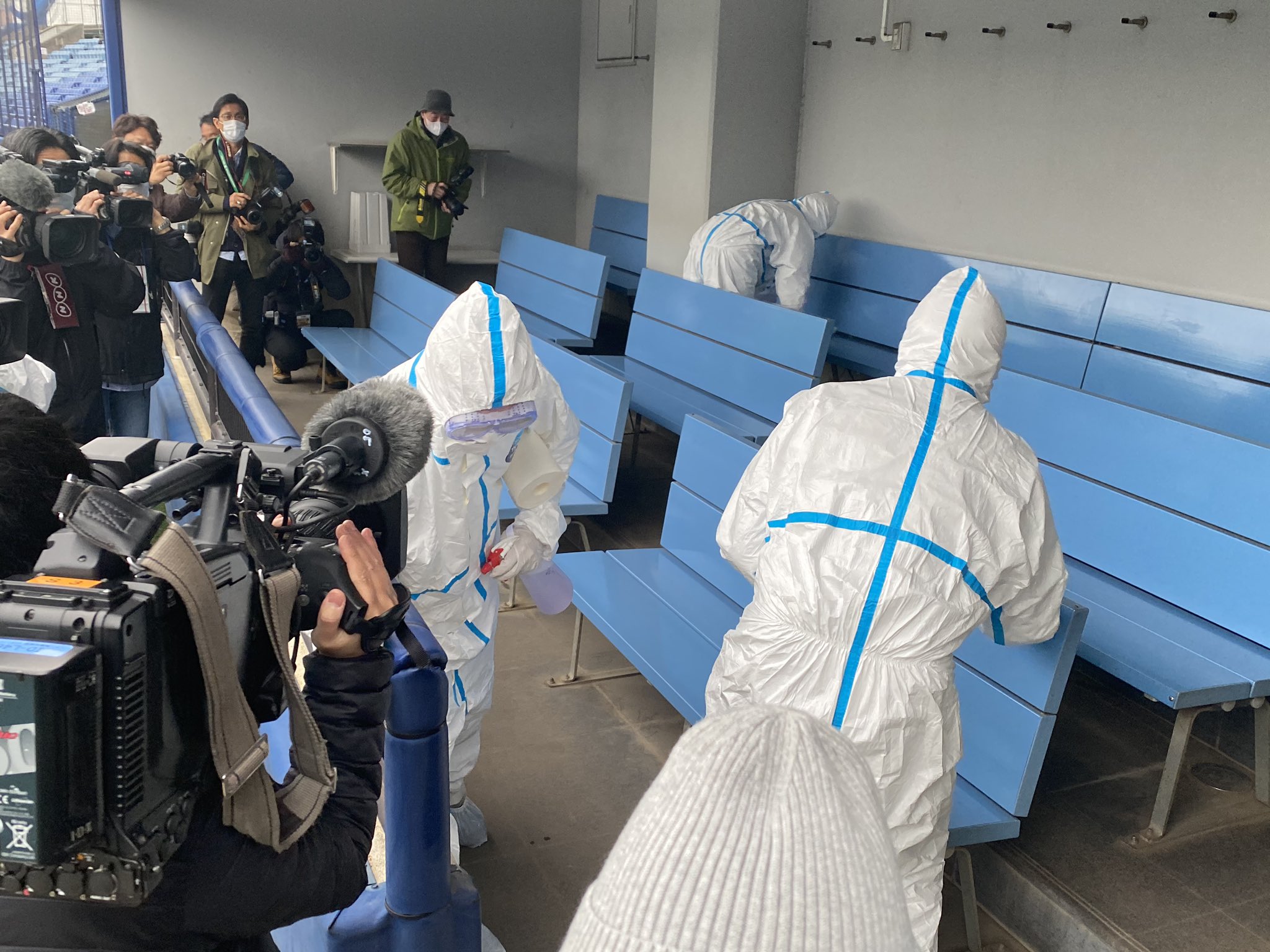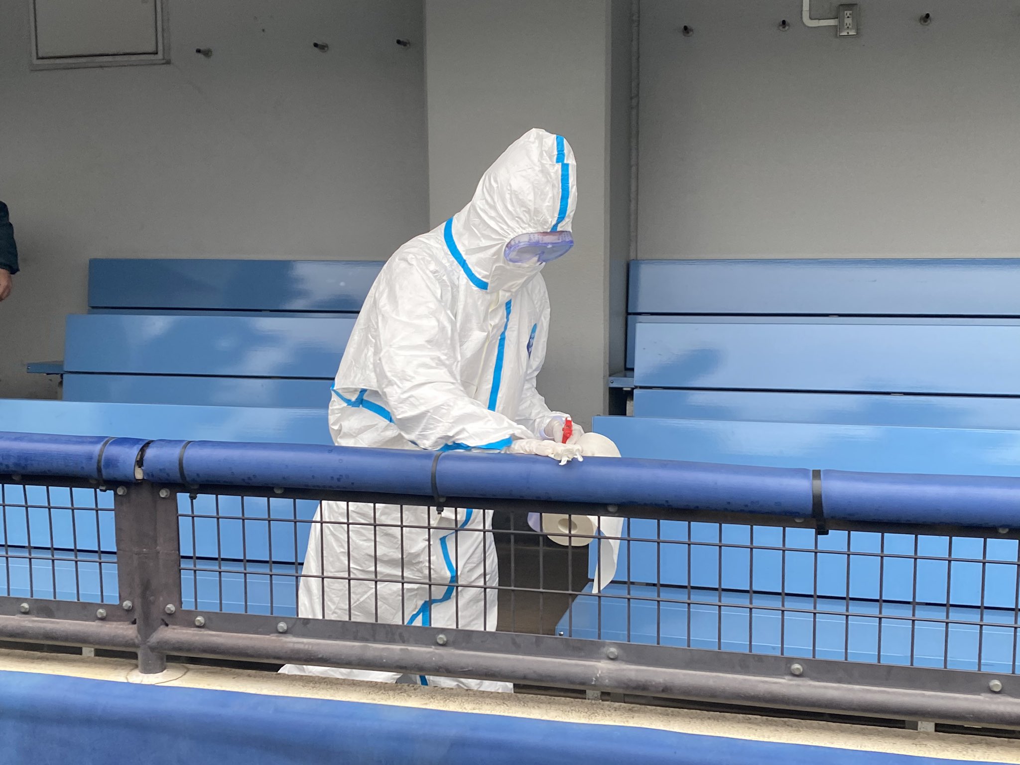 感染が確認された阪神・伊藤隼太外野手(30)が、同球場で22日まで行われた2軍練習試合に出場していたこともあり、防護服に身を包んだ清掃作業員3人が薬剤を染み込ませたペーパータオルで一塁側ベンチやロッカーを中心に消毒。三塁側ベンチや施設の全部屋、エントランス、階段の手すりなど、選手が手を触れそうな箇所を入念にふいて回った。