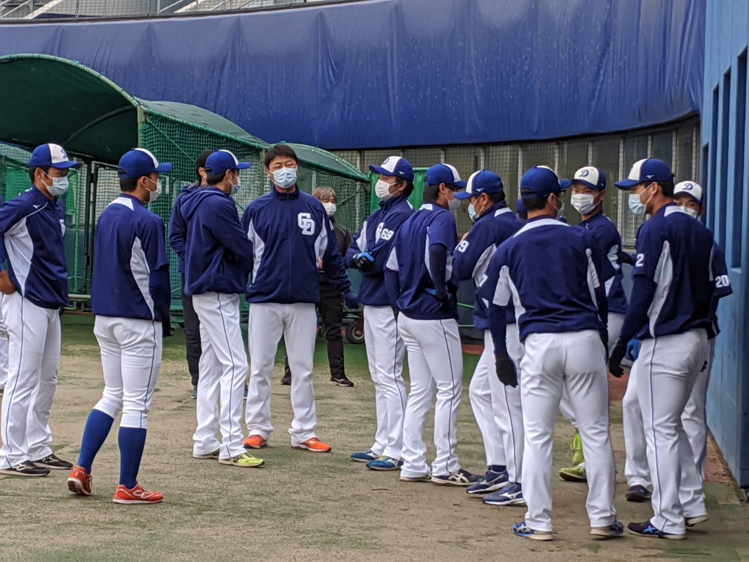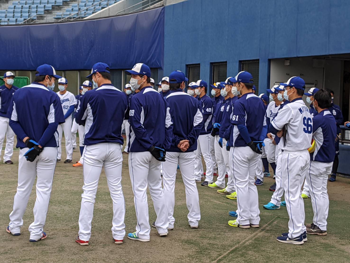 ナゴヤ球場では全員マスク着用という厳戒態勢でグラウンド入りです。