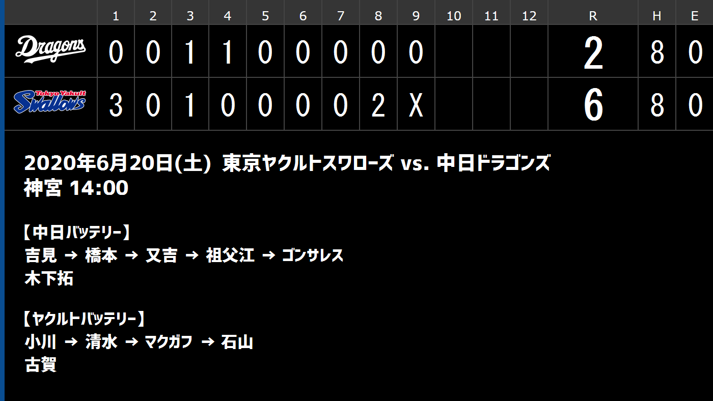 6月20日(土) セ・リーグ公式戦「ヤクルトvs.中日」 スコア速報