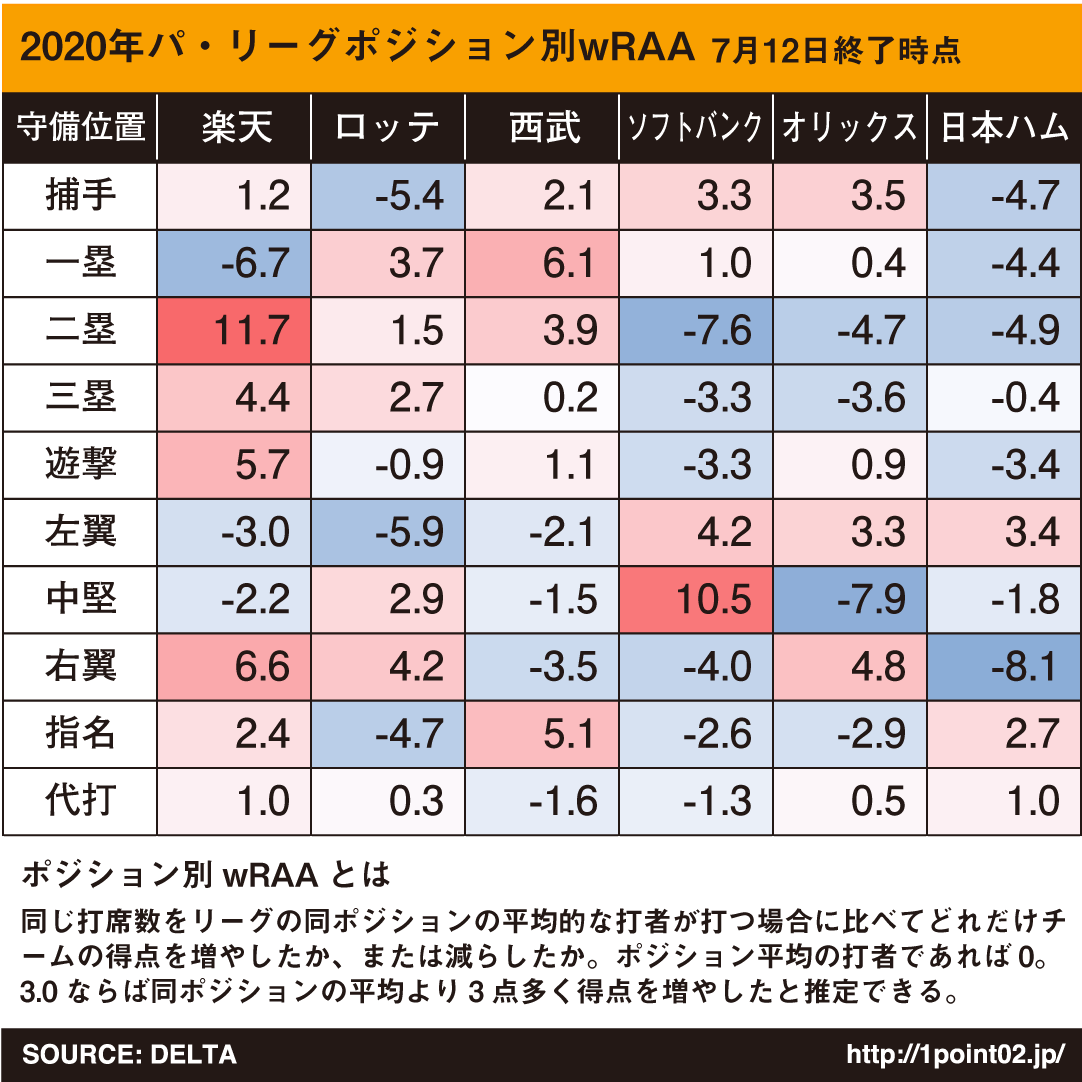 プロ野球12球団、ポジション別攻撃力(7月12日時点)