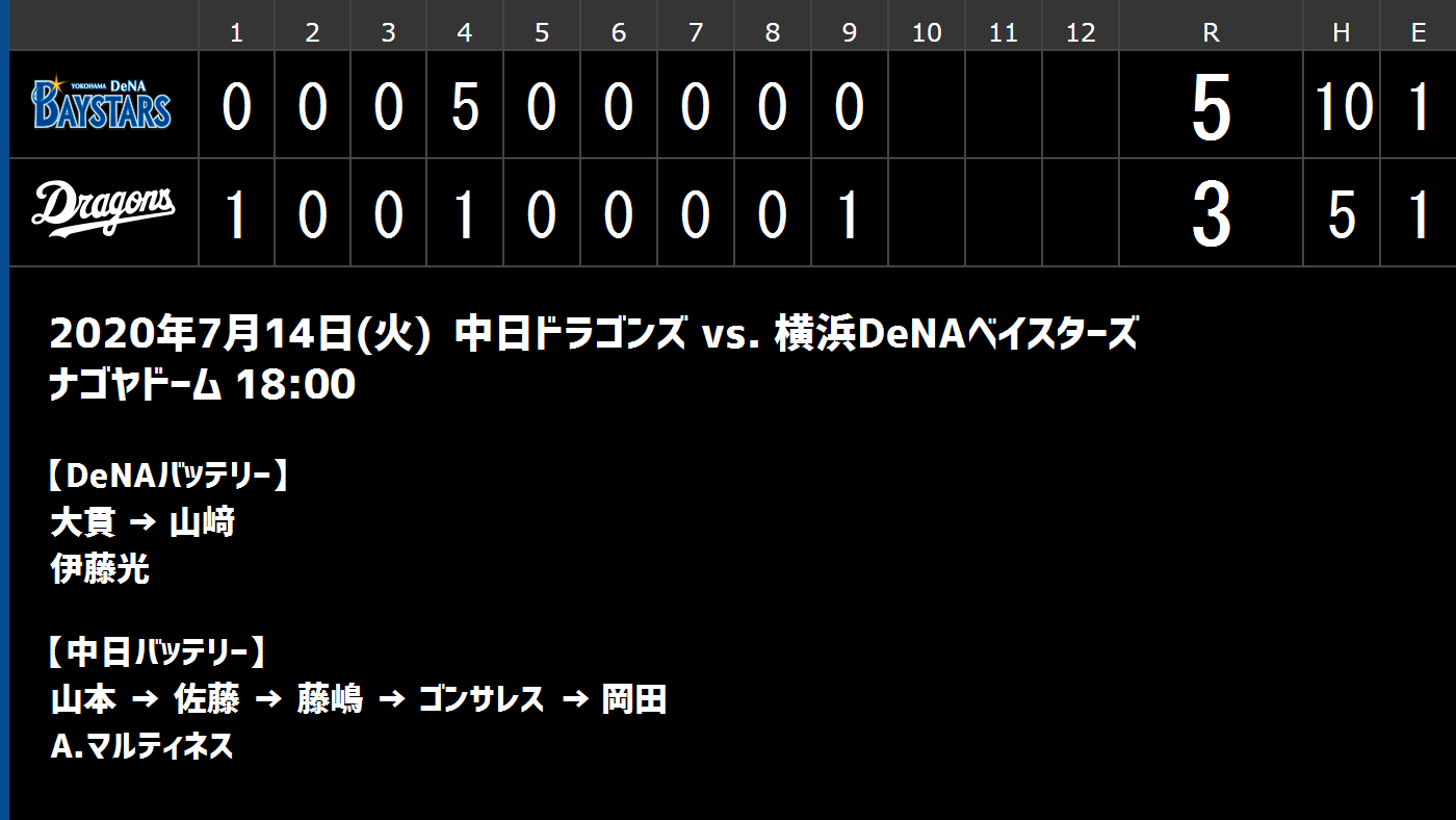 7月14日(火) セ・リーグ公式戦「中日vs.DeNA」 スコア速報