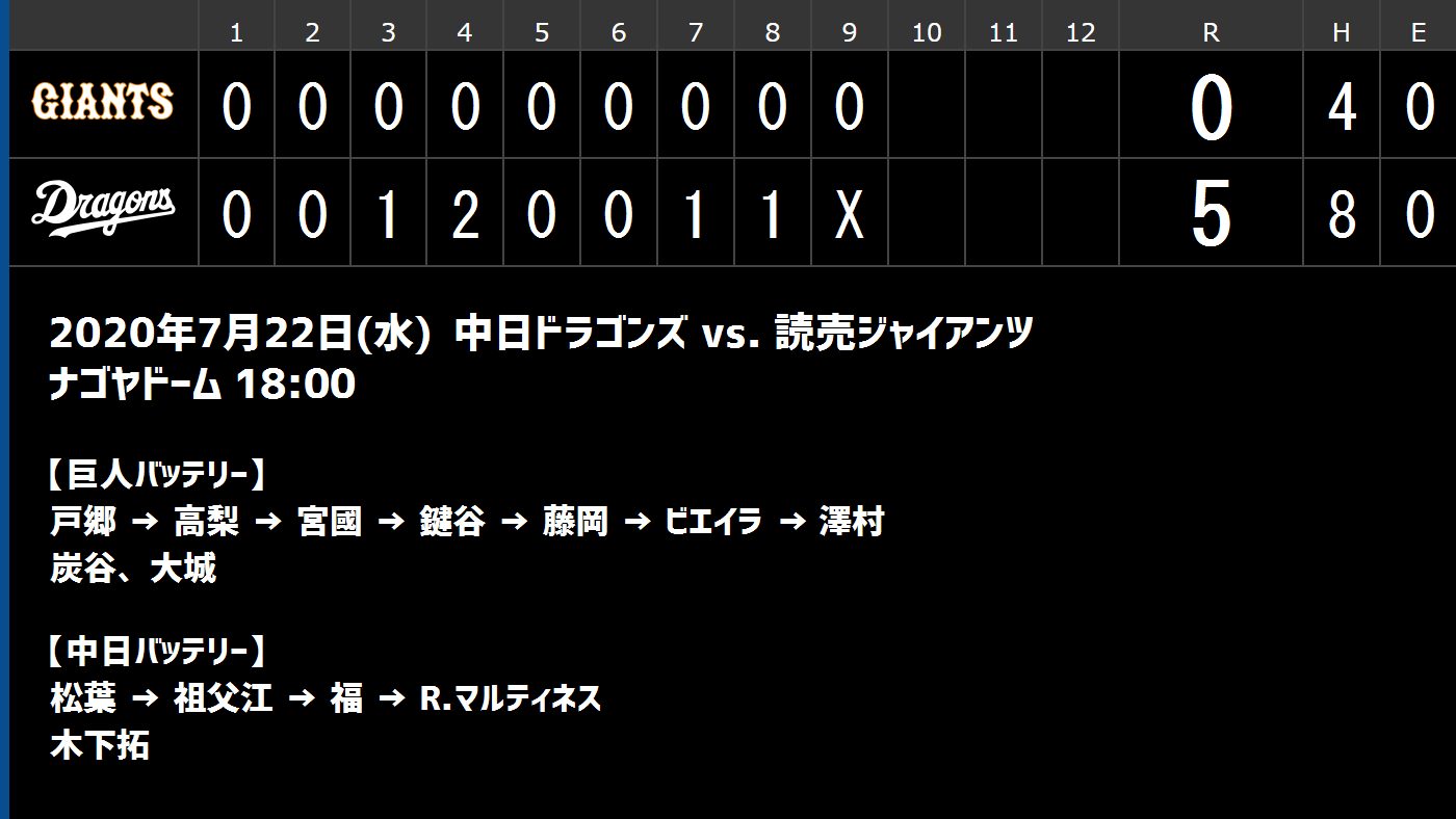 7/22(水) 中日 ○ 5-0 巨人