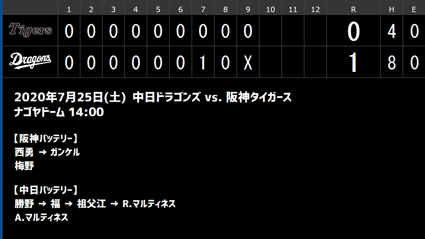 7月25日(土) セ・リーグ公式戦「中日vs.阪神」 スコア速報