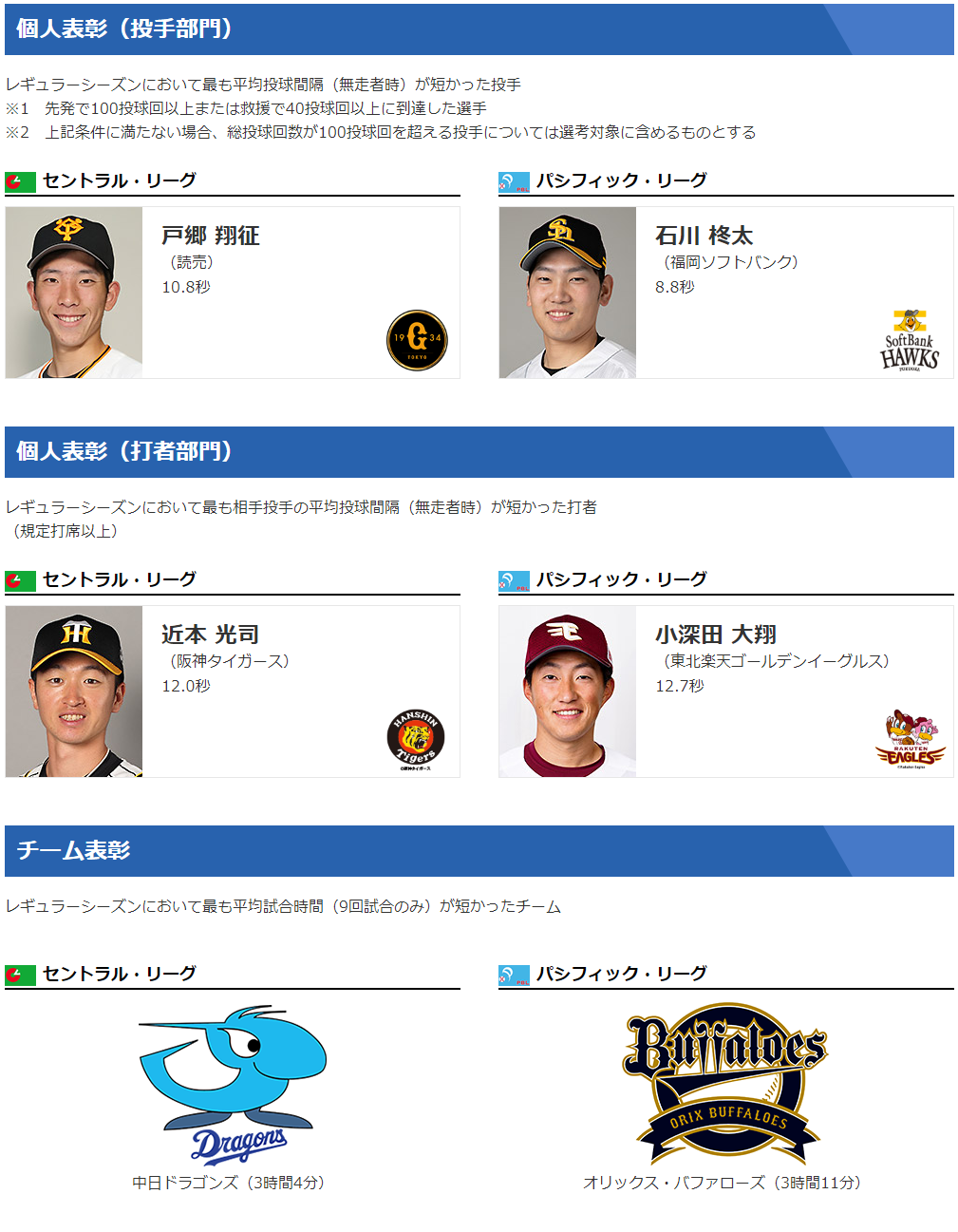 日本プロフェッショナル野球組織がコミッショナー表彰として、試合を心地よく、魅力的にするためにスピーディーに進めた選手及びチームに贈る「スピードアップ賞」が下記の通り決定いたしました。