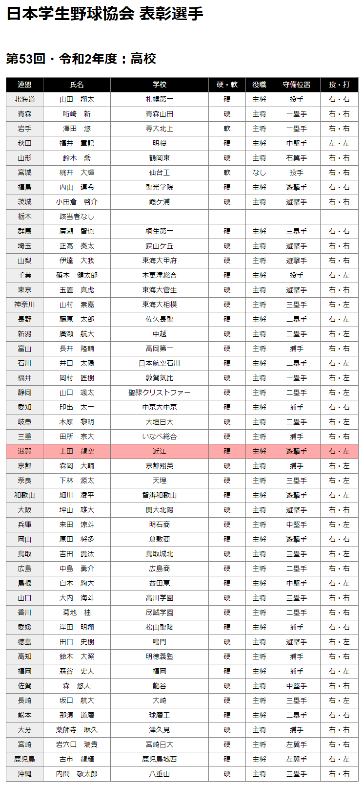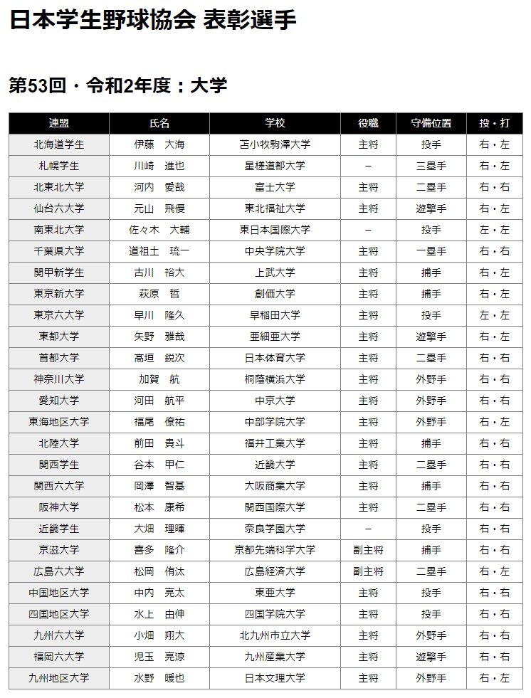 日本学生野球協会 表彰選手 第53回・令和2年度