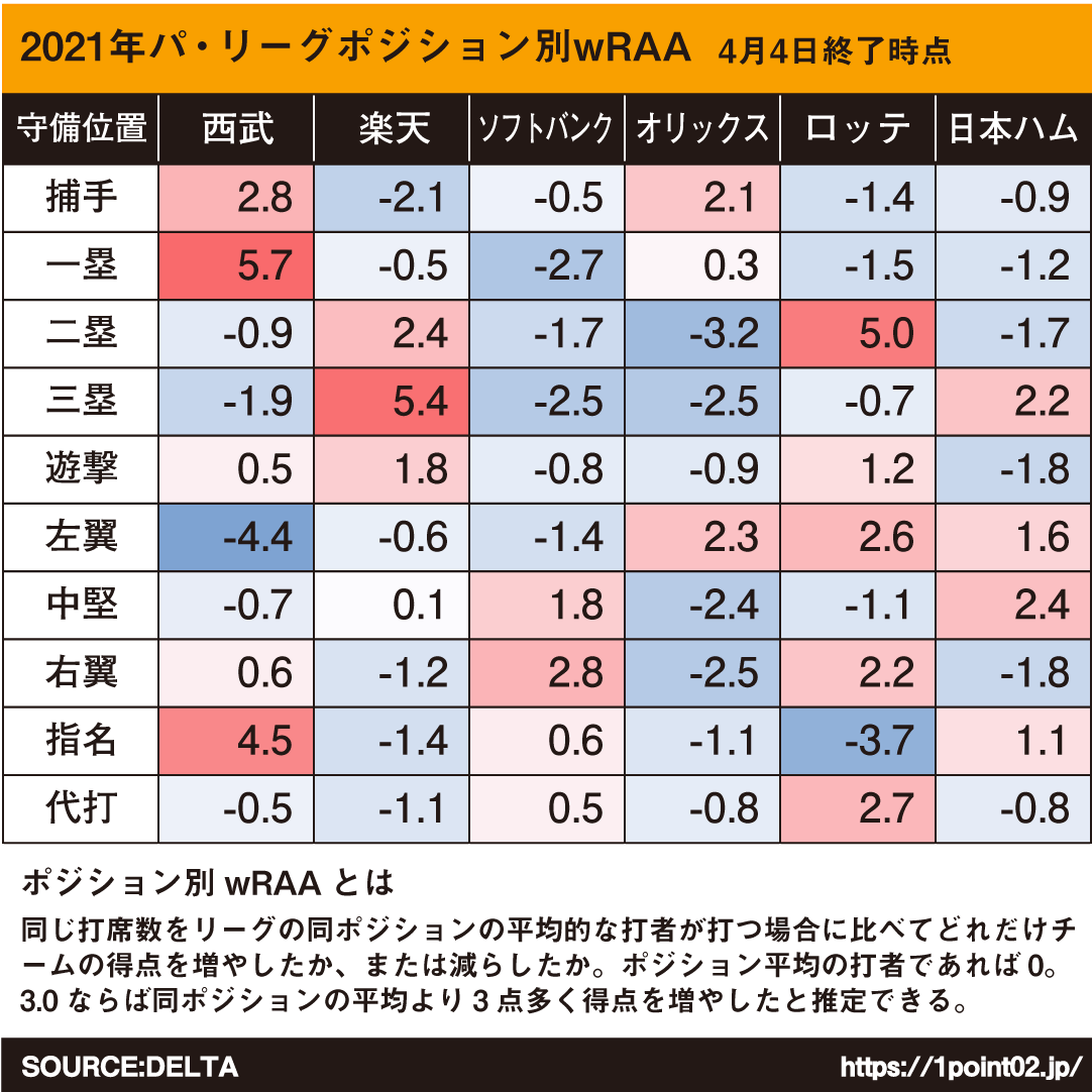 ▼2021年パ・リーグポジション別攻撃力 4.4時点