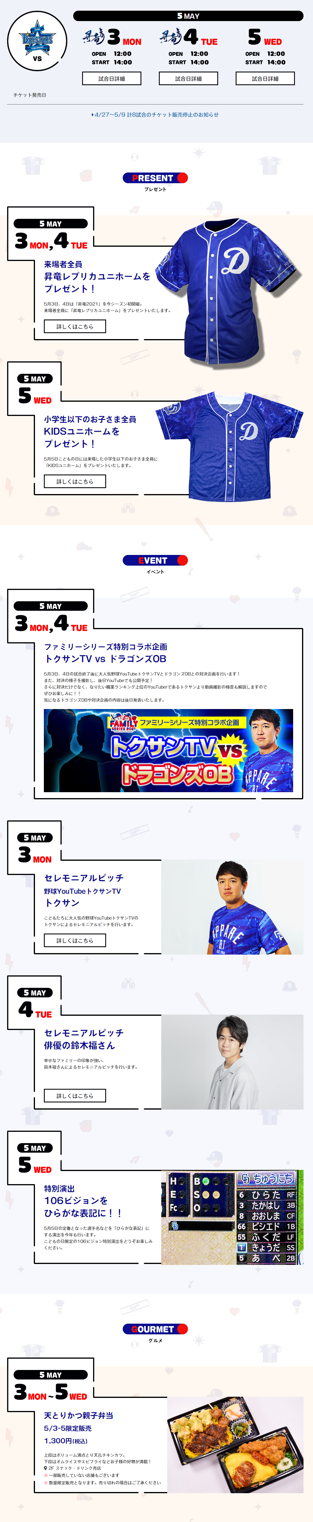 5月3日~5日vs横浜DeNA戦は「ファミリーシリーズ 2021」を開催