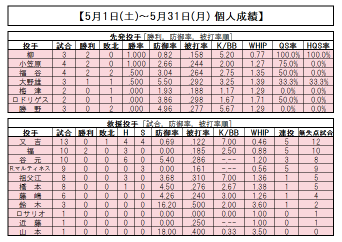 柳投手や又吉投手はもちろん、福投手やR.マルティネス投手も月間防御率0.00と素晴らしい活躍! 投手陣の安定感が素晴らしいですねぇ。