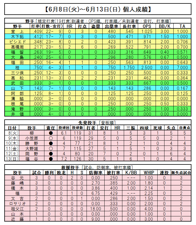 ■2021.06.13 セントラル・リーグ個人打撃成績