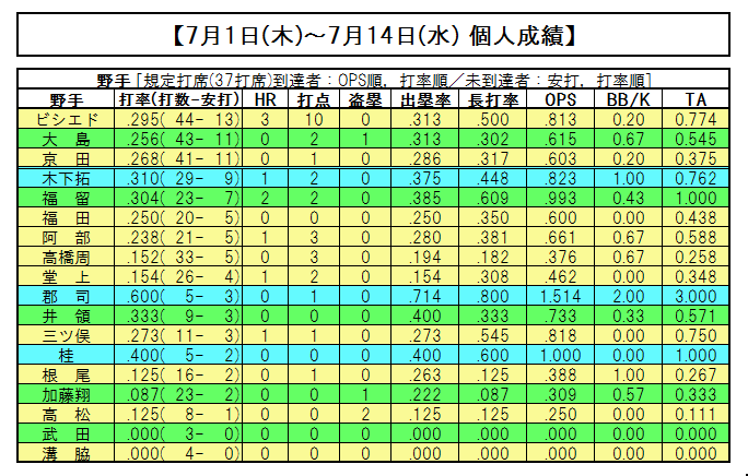 ■2021.07.14 セントラル・リーグ個人打撃成績(前半戦終了時点)
