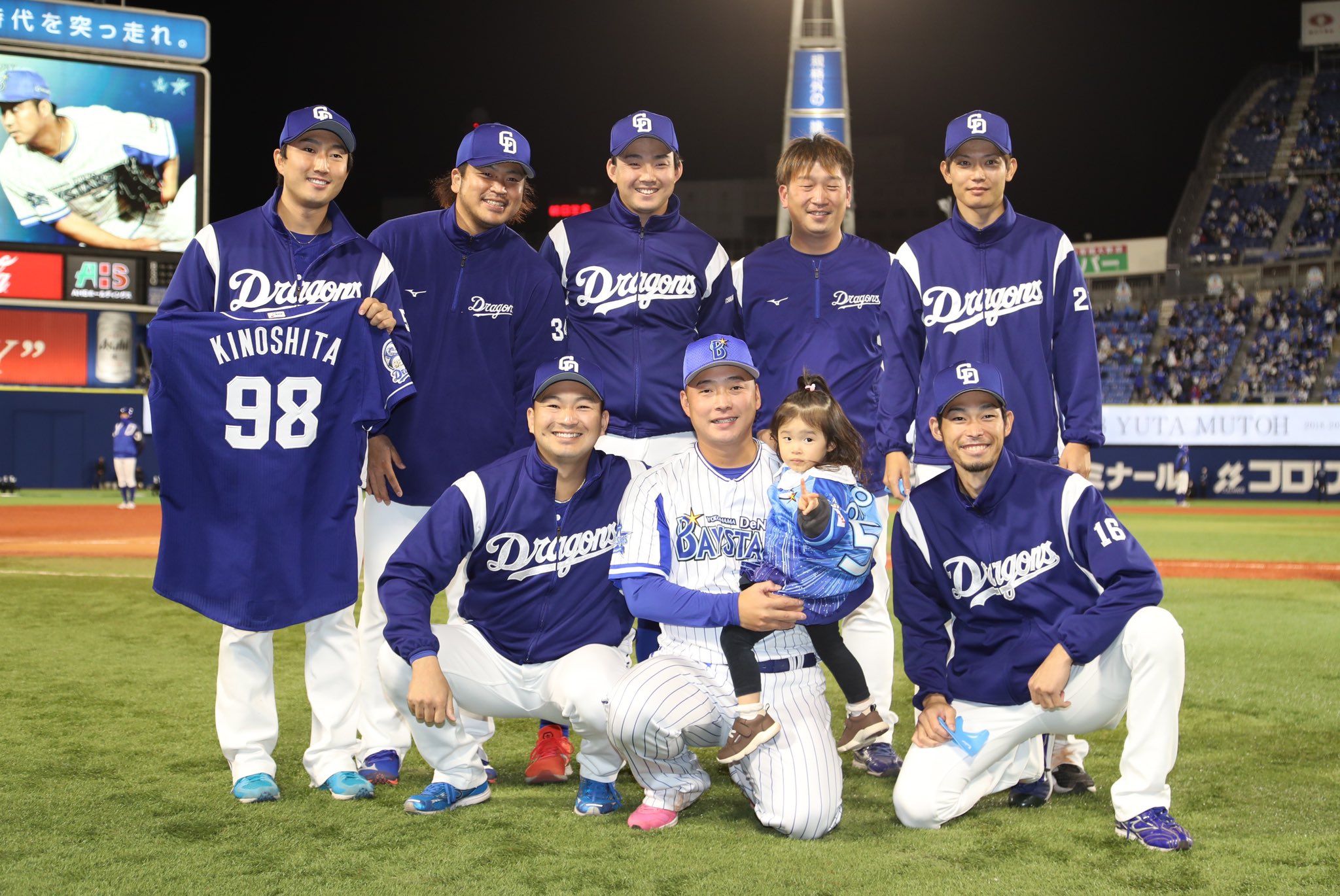 現役引退するDeNA・武藤祐太投手へ大野雄大投手、田島慎二投手、ドアラ、岩瀬仁紀さんがメッセージを送る セレモニー終了後には中日投手陣と記念撮影【動画】