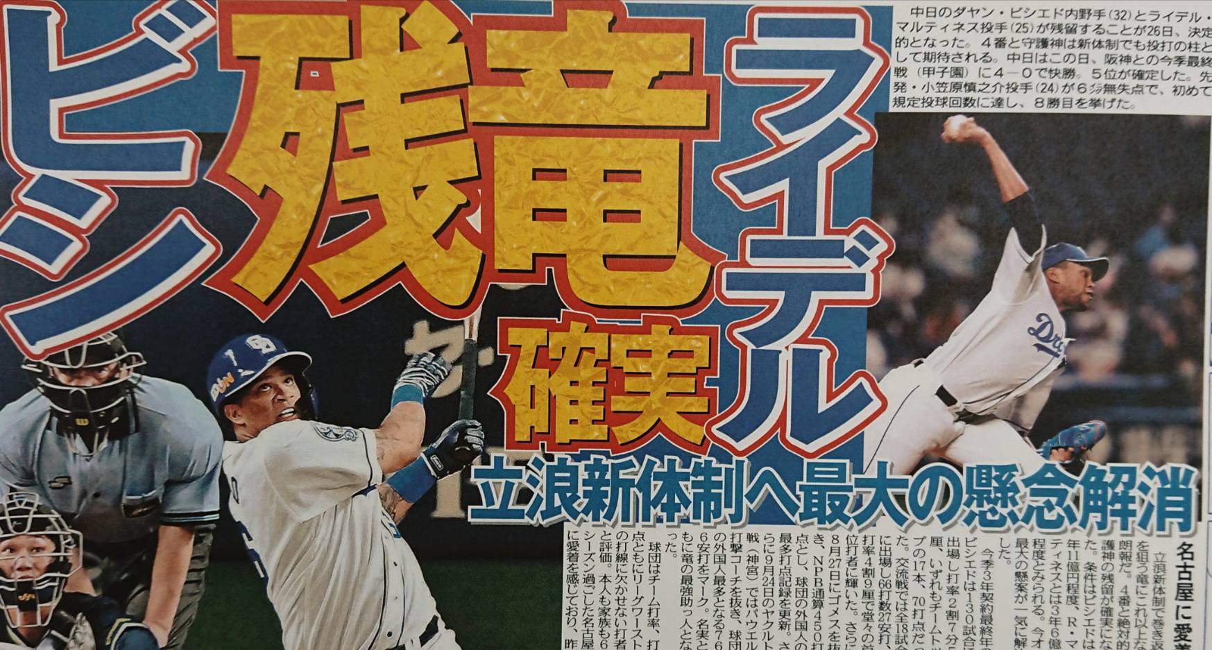中日のダヤン・ビシエド内野手(32)とライデル・マルティネス投手(25)が残留することが26日、決定的となった。4番と守護神は新体制でも投打の柱として期待される。