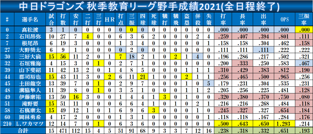 ・中日ドラゴンズ秋季教育リーグ野手成績2021(全日程終了)
