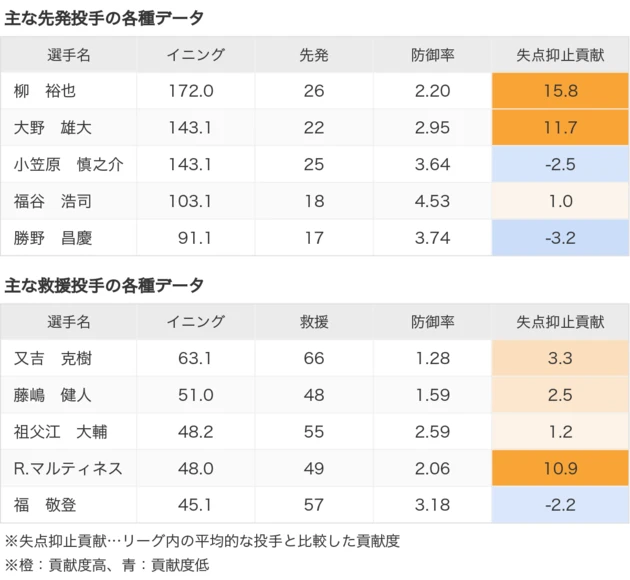 救援では、セットアッパーとしてチーム最多の66試合に登板した又吉がFA権を行使してソフトバンクへと移籍した。貢献度はチーム4位の高さでダメージがないわけではないが、昨季20試合以上に救援登板した投手は又吉を除く7人中6人が平均以上の貢献度。さらに人的補償では実績十分の岩嵜も加わり、層の厚さである程度はカバーできるだろう。ただし左腕は福に頼る部分が多く、さらなる選手の台頭が求められる。シーズン序盤に結果を残した橋本や、ドラフト3位ルーキーの石森らが、分厚いリリーフ陣に割って入ってくることを期待したい。