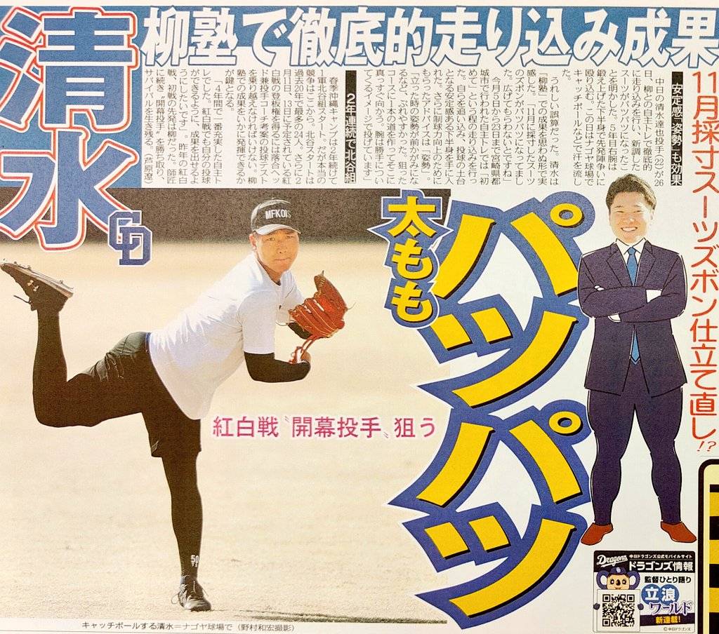 清水、太ももパツパツ。柳塾で徹底走り込み成果。11月採寸のスーツズボン仕立て直し?#中日ドラゴンズ #清水達也 #東京中日スポーツ はWEB購入できます↓https://t.co/LHAA3LRpVa pic.twitter.com/L3vWkNF7lp