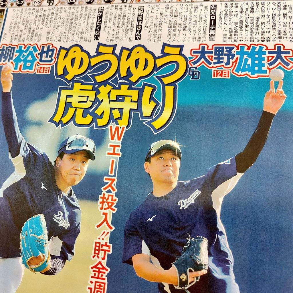 中日が先発ローテを再編。12~14日の阪神戦は #大野雄、#勝野、#柳 の投入が濃厚。今季初の貯金を目指す。#中日ドラゴンズ #東京中日スポーツ はWEB購入できます↓https://t.co/LHAA3LRpVa pic.twitter.com/MkVsgo6mGB