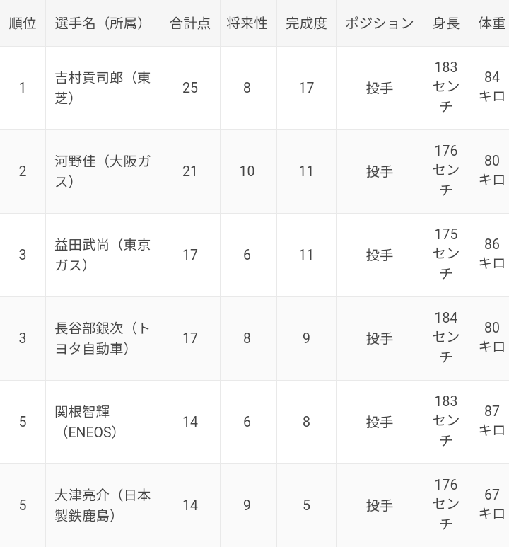 吉村(東芝)が頭一つ抜けている印象で、1位の可能性も十分にありそうです。これから本格的に始まる都市対抗予選、そして本大会で評価を上げる選手にも期待したいですね。