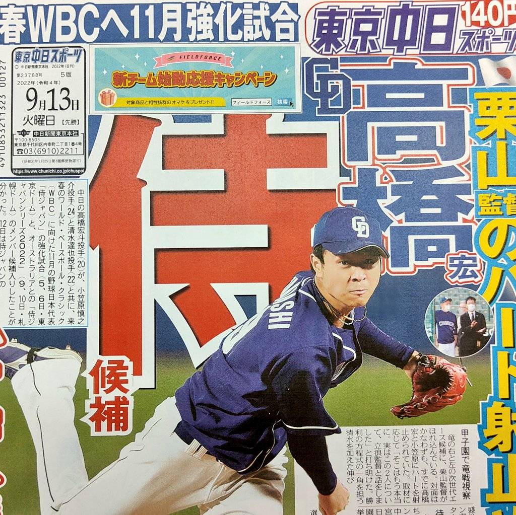 中日の高橋宏斗投手(20)が、小笠原慎之介投手(24)と清水達也投手(22)と共に、来春のワールド・ベースボール・クラシック(WBC)に向けた11月の野球日本代表「侍ジャパン」の強化試合(5、6日・東京ドーム)と、オーストラリアとの「侍ジャパンシリーズ2022」(9、10日・札幌ドーム)のメンバー候補入りしたことが分かった。12日は侍ジャパンの栗山英樹監督(61)が、阪神戦(甲子園)を視察。高橋宏と小笠原を高く評価した。