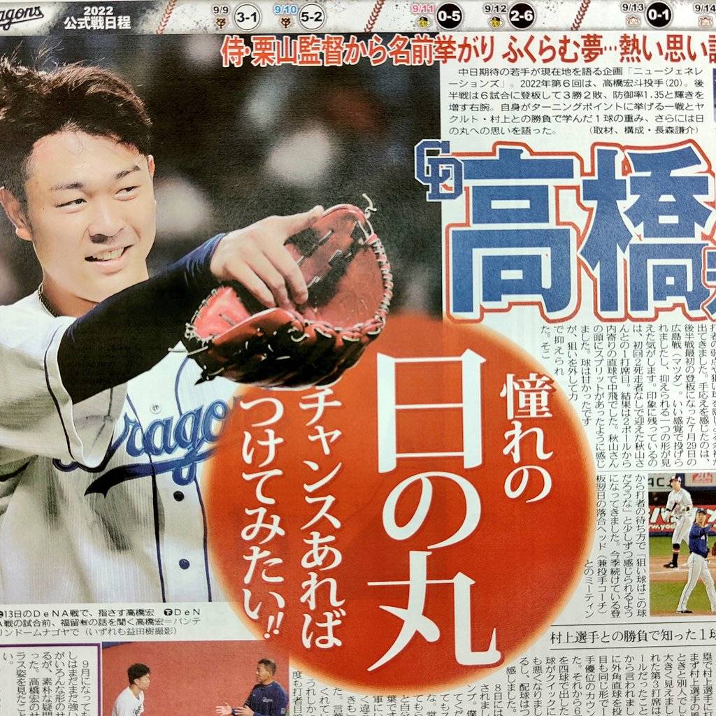最後に日本代表への思いをお話しします。栗山監督に来春のワールド・ベースボール・クラシック(WBC)に向けた野球日本代表「侍ジャパン」の強化試合(11月5、6日・東京ドーム)と、オーストラリアとの「侍ジャパンシリーズ2022」(同9、10日・札幌ドーム)のメンバー候補として名前を挙げていただきました。正直、意識は全然なかったです。でもチャンスがあれば、日の丸はつけてみたい、そのレベルの選手になりたいと思います。日の丸で真っ先にイメージするのは昨夏の東京五輪。テレビで代表の皆さんの試合を見ていました。そして今、金メダリストの大野(雄大)さんと一緒にプレーできることが本当にありがたいと感じます。僕は日本代表になったことは一度もないので憧れます。僕も代表を目指せるような選手になりたい。そのために残りのシーズン、勝てるように頑張ります。(中日ドラゴンズ投手)