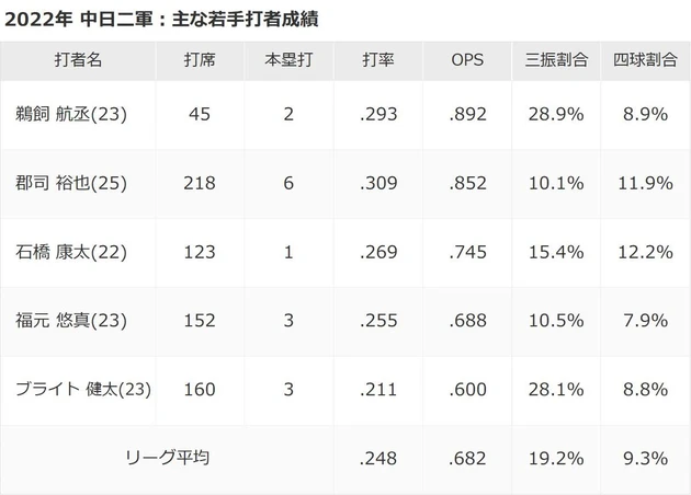 一方の野手陣では、今季から外野に挑戦した3年目捕手の郡司裕也が3割を超える打率を記録。一軍では思うような結果を残せなかったが、首脳陣の期待は大きい。ルーキーの福元悠真は7月7日に一軍でプロ初スタメンを果たし、うれしい初ヒットも放った。同じくルーキーのブライト健太は、度重なる故障もあり実力を発揮しきれなかったが、要所で身体能力の高さを伺わせるプレーを見せた。今季リーグ最下位に沈んだ中日は、戦力の底上げが急務となる。岡林勇希や土田龍空に続く、活きの良い若手の台頭が待ち望まれる。