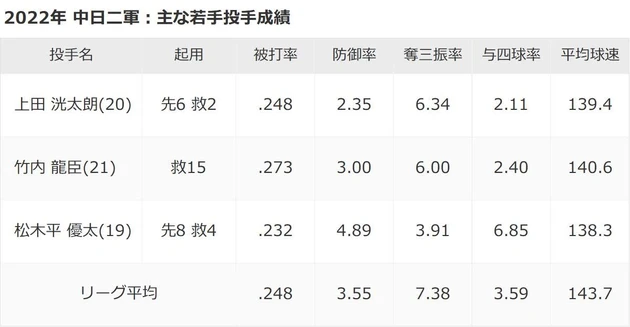 中日の投手陣では、2年目左腕の上田洸太朗が春先から安定したピッチングを見せ、5月に支配下契約を締結。一軍で8試合に登板して2点台の防御率を記録するなど、実力の高さを存分にアピールした。育成右腕の松木平優太は制球面に課題を残すも、前年を上回る登板機会を得て、貴重な経験を積んだ。また、ケガから復帰した育成の竹内龍臣は15試合に救援登板。防御率3.00とまずまずの結果を残し、順調な回復ぶりをアピールした。
