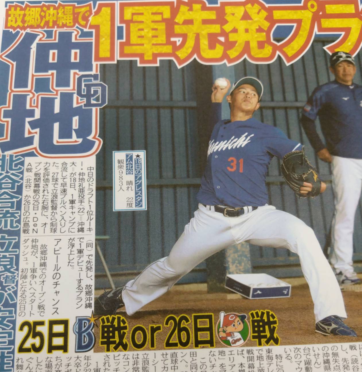 故郷沖縄でのオープン戦で仲地が、1軍争いへスタートダッシュ。初陣となる25日のDeNA戦(北谷)と翌26日の広島戦(北谷)の2試合のどちらかで、先発して1軍デビューするプランが、右腕の1軍キャンプ合流初日に浮上した。
