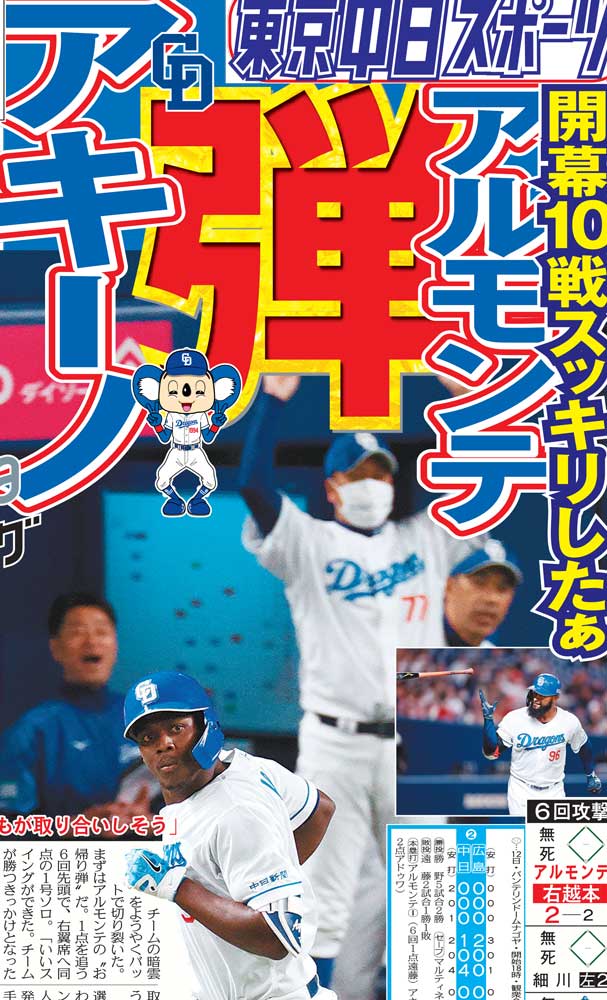 【中日】開幕10戦でスッキリ!アルモンテが“お帰り弾”、アキーノの“初めまして弾”で快勝し連敗を『3』でストップ
