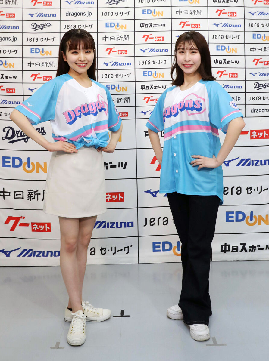 今年の #ドラ恋 ユニホームのお披露目です。#名古屋芸大 ビジュアルデザインコースの学生さんがデザインしたもので、チアドラのお二人が着てくれました。6月3日の #オリックス 戦(土)、8月11日の #広島 戦(金・祝)の2試合、チケット持参の女性に配布予定です。#ドラゴンズ pic.twitter.com/W5yuFvY3cc