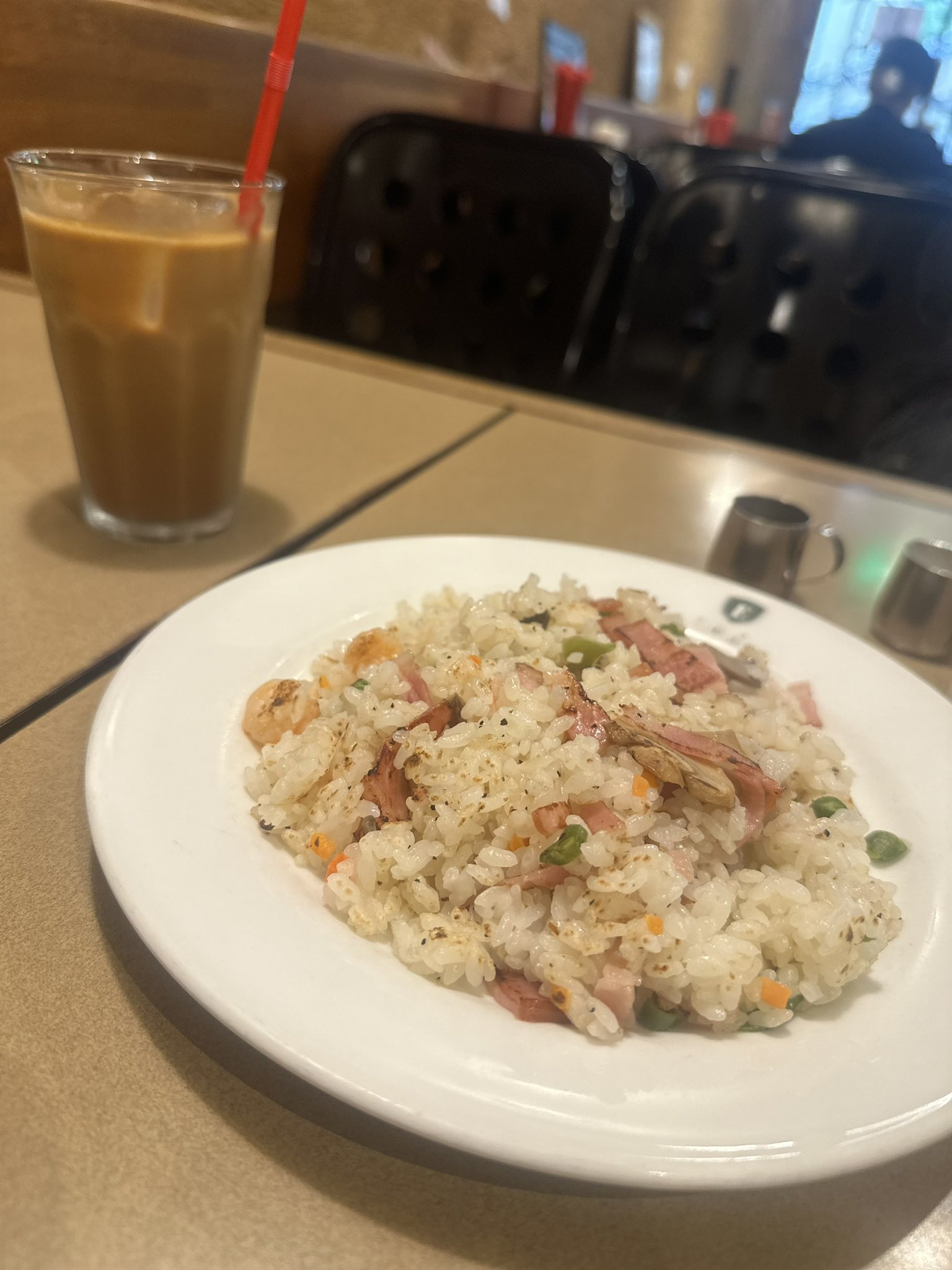 本日の一杯。昔から良く食べていたピラフ。ピラフとアイスコーヒー、このセット最高😃懐かしい味でした😭