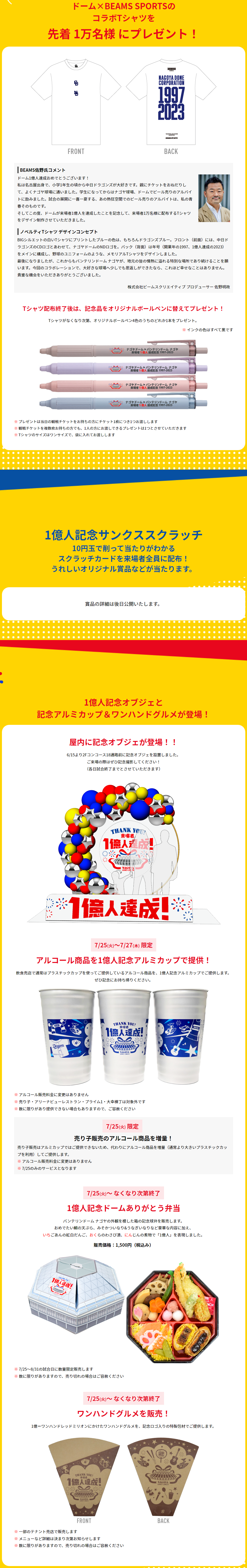 「ドーム1億人達成!サンキューベリーマッチ」1億人記念オブジェと記念アルミカップ&ワンハンドグルメが登場!
