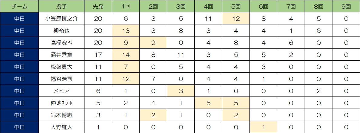 ドラゴンズ先発陣は立ち上がりの失点が多い傾向です。