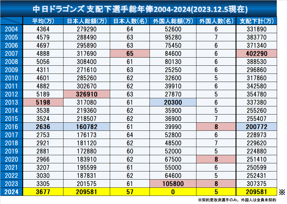 中日、日本人平均年俸が上がる