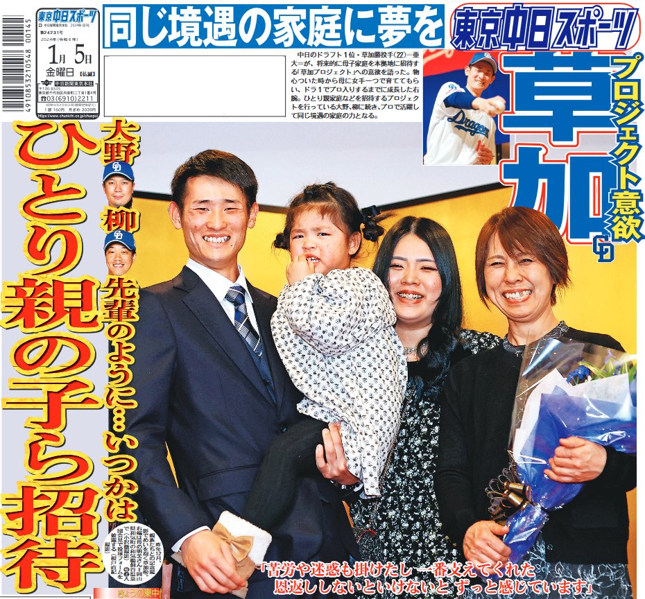 〔ちょい見せトーチュウ 1/5〕1面#中日ドラゴンズ ドラフト1位 草加 母子家庭を本拠地に招待するプロジェクトへ意欲。同じ境遇の家庭に夢を! #草加勝 #東京中日スポーツ はWEB購入できます↓https://t.co/LHAA3LRXKI※午前5時より販売#トーチュウでゲット pic.twitter.com/GkqCo2ShCa
