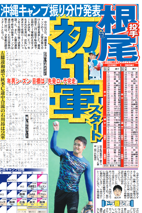 中日は17日、沖縄春季キャンプの1、2軍の振り分けと日程を発表した。根尾昂投手(23)は投手転向後では初めて1軍組の北谷スタートが決定。辰(たつ)年生まれの年男は、厄払いも済ませて先発ローテーションを1年間守り抜く決意を語った。また、左膝の違和感で昨年の秋季キャンプは途中合流だった石川昂弥内野手(22)は、2軍組の読谷スタートとなった。