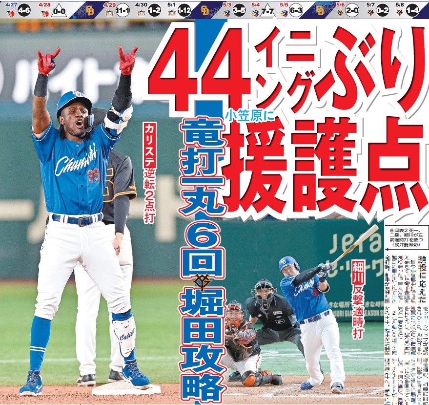 〔ちょい見せトーチュウ 5/23〕3面#中日ドラゴンズ 小笠原に44イニングぶり援護点! 6回に細川反撃適時打、カリステ逆転2点打! #細川成也 #カリステ #東京中日スポーツ はWEB購入できます↓https://t.co/LHAA3LRXKI※午前5時より販売#トーチュウでゲット pic.twitter.com/RegNpfvpRm