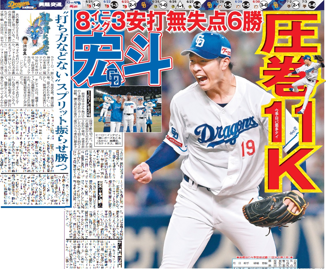 〔ちょい見せトーチュウ 7/13〕3面#中日ドラゴンズ 宏斗 圧巻11K! 8イニング3安打0封で6勝目! #高橋宏斗 #東京中日スポーツ はWEB購入できます↓https://t.co/LHAA3LRpVa※午前5時より販売#トーチュウでゲット pic.twitter.com/9T9INbvp9K