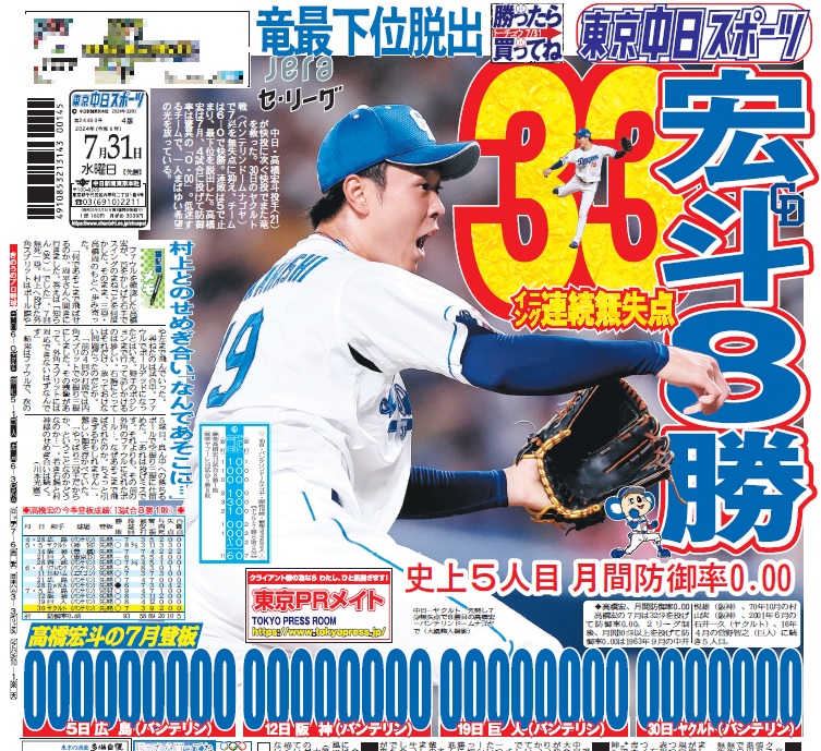 2リーグ分立後、月間30イニング以上を投げて防御率0・00としたのは1963年9月の中井悦雄(阪神)、70年10月の村山実(阪神)、2001年6月の石井一久(ヤクルト)、16年4月の菅野智之(巨人)に続き5人目となる。