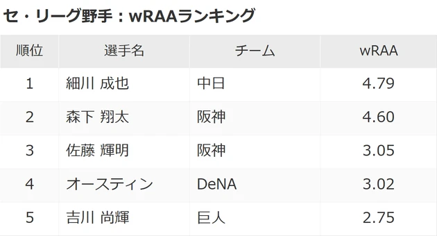 セ・リーグの野手では、2年連続の20本塁打に到達した細川成也(中日)がトップに立った。2位には持ち前の勝負強さで打点を積み重ねた森下翔太(阪神)、3位にはプロ4年目で通算300打点を突破した佐藤輝明(阪神)が名を連ねた。
