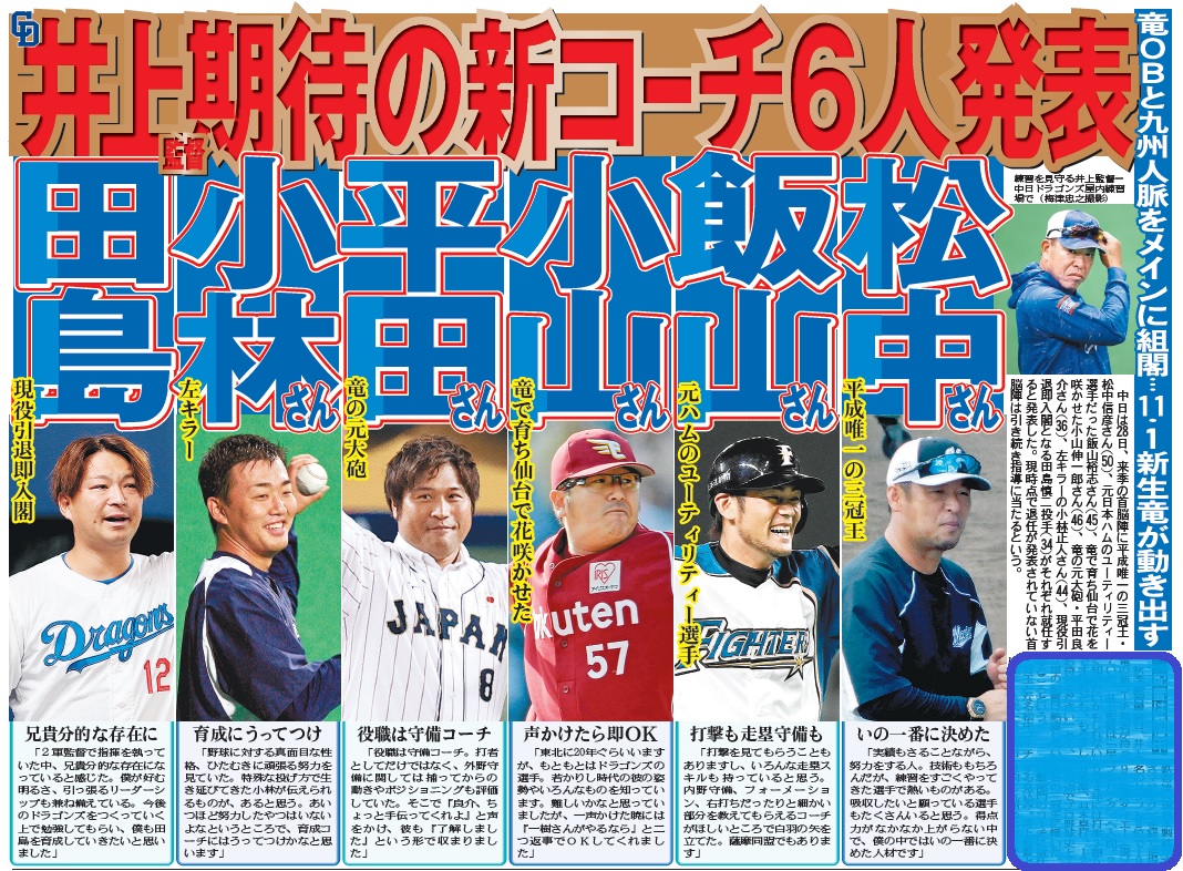 新コーチ発表#松中信彦 平成唯一の三冠王#飯山裕志 薩摩同盟#小山伸一郎 竜育ち楽天で活躍#平田良介 外野守備コーチへ#小林正人 左キラー#田島慎二 引退即入閣#中日ドラゴンズ