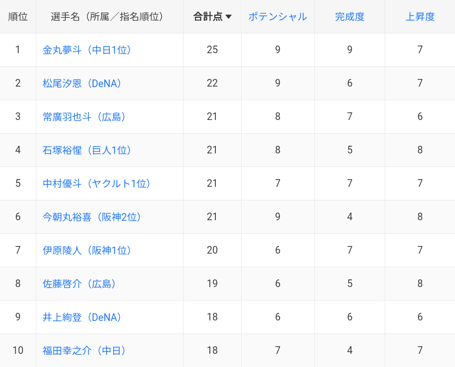 将来、大きく羽ばたきそうな若手有望株のランキングだ。10月24日に行われた今年のドラフト会議では支配下69人、育成54人の合計123人が指名を受けたが、そのなかには1年目から主力級の活躍が期待できそうな選手もおり、また高校生でも2年後、3年後には一軍に定着してスターへの道を歩む可能性を秘めた逸材もいる。もちろん、すでにプロの世界で揉まれ、来シーズン以降が楽しみな若武者も多い。そうした次代のスター候補を「ポテンシャル」「完成度」「上昇度」の3項目で評価。2025年シーズンの新人王資格を持つ選手のみを対象とし、セ・パそれぞれ15位まで紹介する。