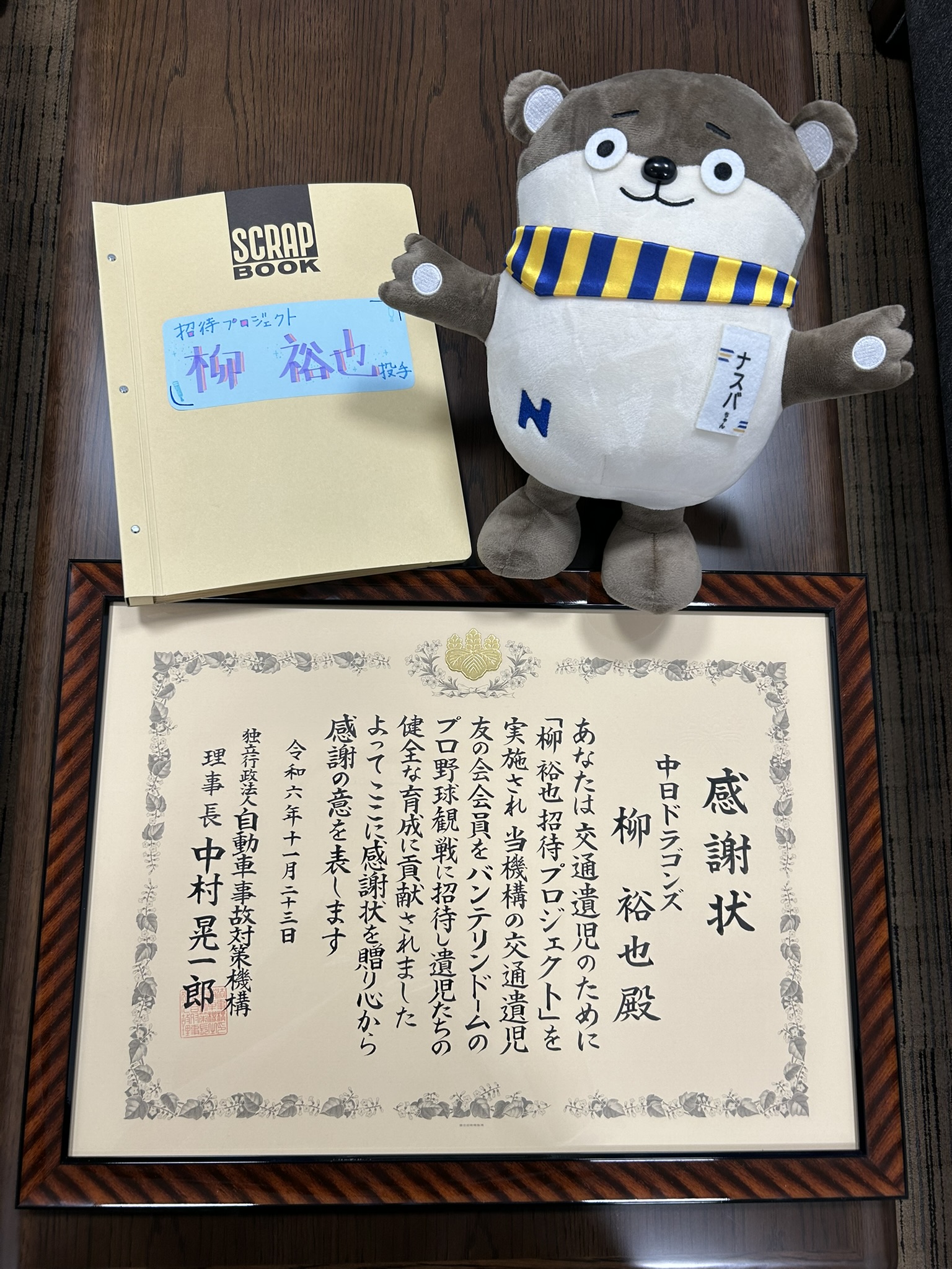 これまで3年間にわたり「#柳裕也招待プロジェクト」により、100名を超えるナスバ交通遺児等友の会会員を野球観戦に招待していただいたことに対して、柳裕也投手に感謝状と会員のお手紙を贈呈させていただきました。