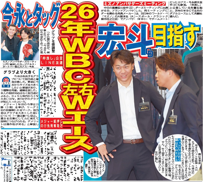 高橋宏自身、今永とは「仲良しです」と話す”ライン友達”。メジャー1年目を終えた左腕は今季29試合に登板し、リーグ3位の15勝(3敗)、防御率2・91をマーク。「びっくりするぐらいの活躍。人としては何も変わっていなかったですが」。今年11月に行われたプレミア12の開催中も、巨人・大勢と3人で連絡を取り合っていたという。「ご飯食べに行こうって言っているんですけど、なかなか予定が合わないので…」。お互い多忙なスケジュールも一流選手の証しだ。